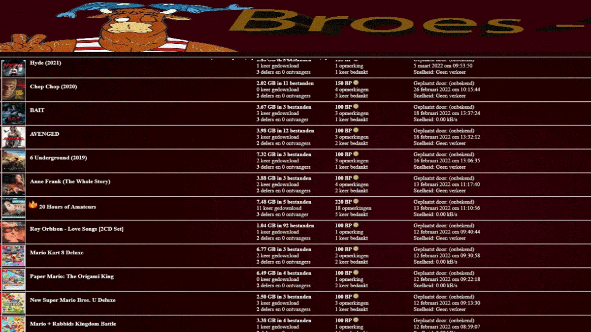 Broesteam is een torrent site met een Nederlands aanbod. Zo kan je er dvd films downloaden met Nederlandse ondertiteling. Maar ook tv series en Nederlandse muziek.
