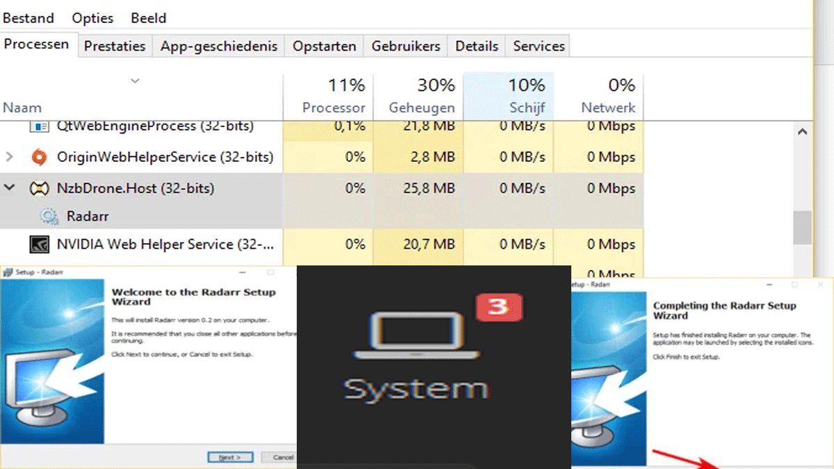 Als je taakbeheer start van Windows. Via Alt+Ctrl+ del toets. Dan kan je Radarr terug vinden onder NZBdronehost.