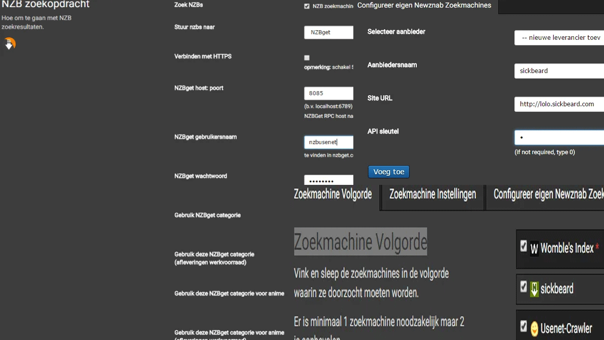 Neem bovenstaande over. En klik op Voeg Toe. Als je dat gedaan hebt gaan we zoveel mogelijk Newznab providers toevoegen. Want hoe meer Newznab providers je er toevoegt hoe groter de kans is dat je serie volledig wordt gedownload. Zie hier een aantal gratis Newnnab providers. Je moet voor elke Newznab provider een account aanmaken. Als je er zoveel mogelijk hebt toegevoegd kies dan voor Opslaan.