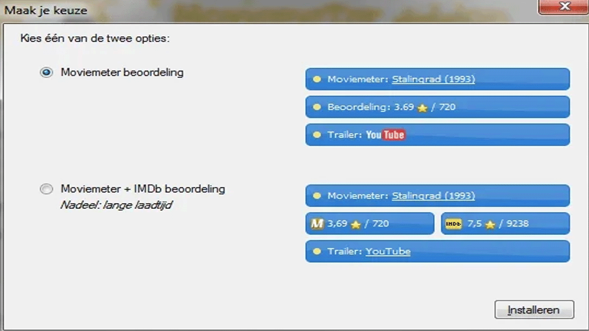 Nu heb je de keuzen om met IMD te kiezen of zonder IMDB. Persoonlijk gaat mijn voorkeur uit naar IMDb. Dit omdat er meer gebruikers zijn dus dan is automatisch de film waardering beter. Echter hoe meer je toevoegt hoe langer de laad tijd natuurlijk. Klik op Installeren.