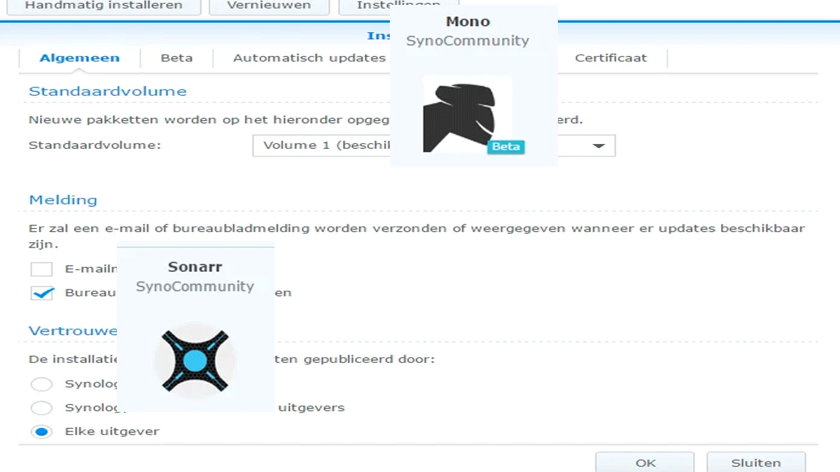 Voordat we Sonarr kunnen installeren. Moeten we als eerst een repository toevoegen. Anders weet je Synology niet waar Sonarr gedownload kan worden. We gaan de volgende repository http://packages.synocommunity.com toevoegen.