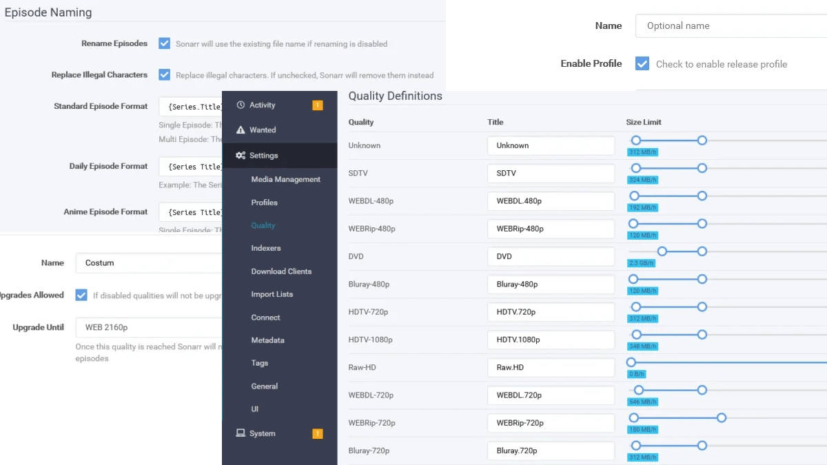 Als je ietsjes naar benden gaat zie je Release profiles. Klik op dat plusje beneden, en voeg bij het veld Must not contain x265 toe als je media speler hier niet meer overweg kan. De meeste media spelers kunnen namelijk alleen overweg met x264.
