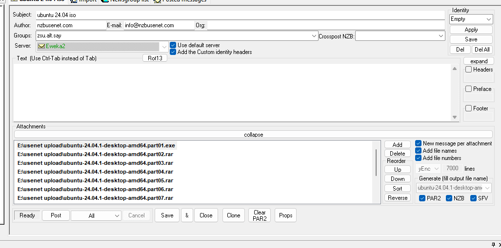 Het kan zijn dat je een aparte upload server nodig hebt deze informatie kan je vinden op de website van je Usenet provider. Ook kan het zo zijn dat je dit aan moet zetten op de website van je usenet provider. Bij Eweka is dit bijvoorbeeld post.eweka.nl poort 119.